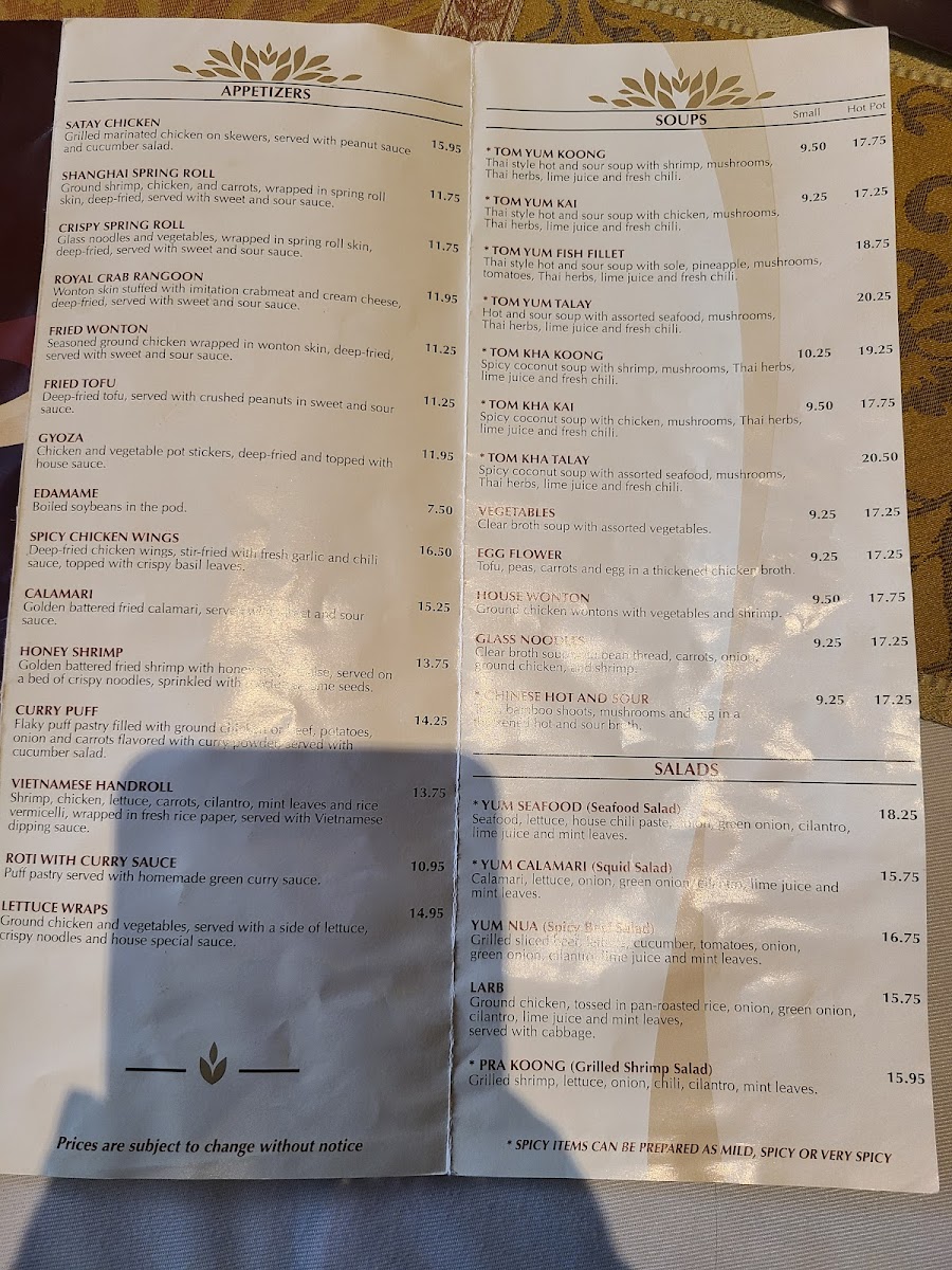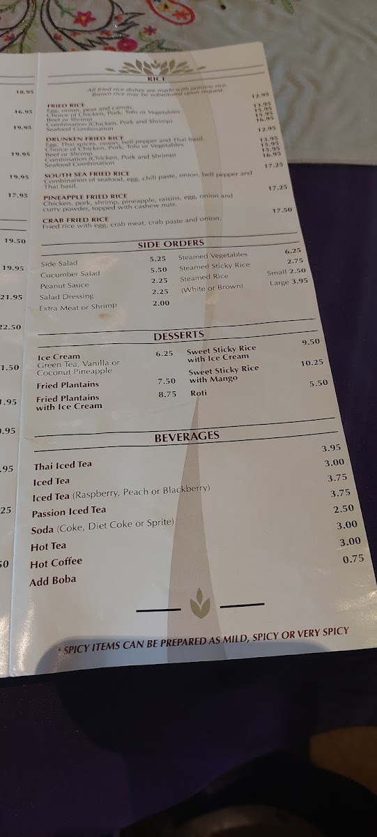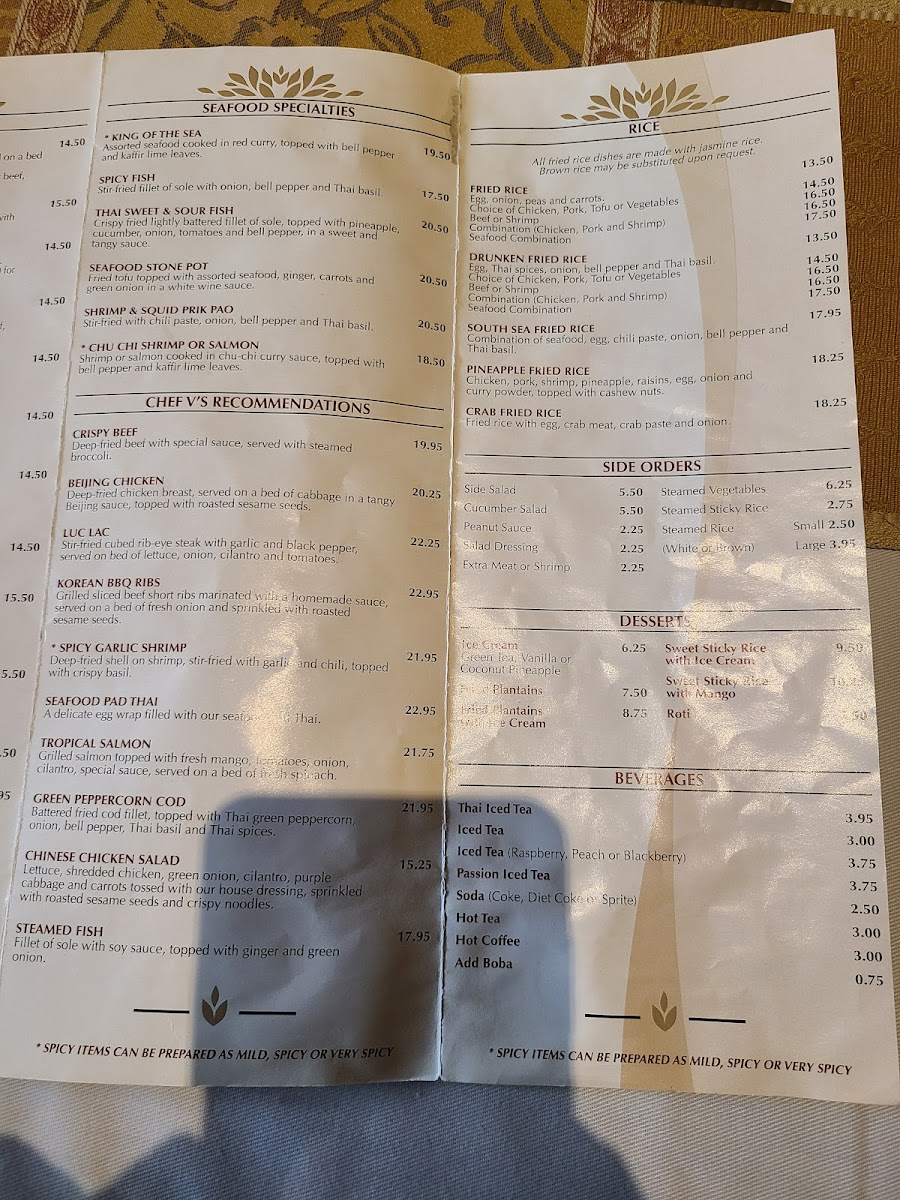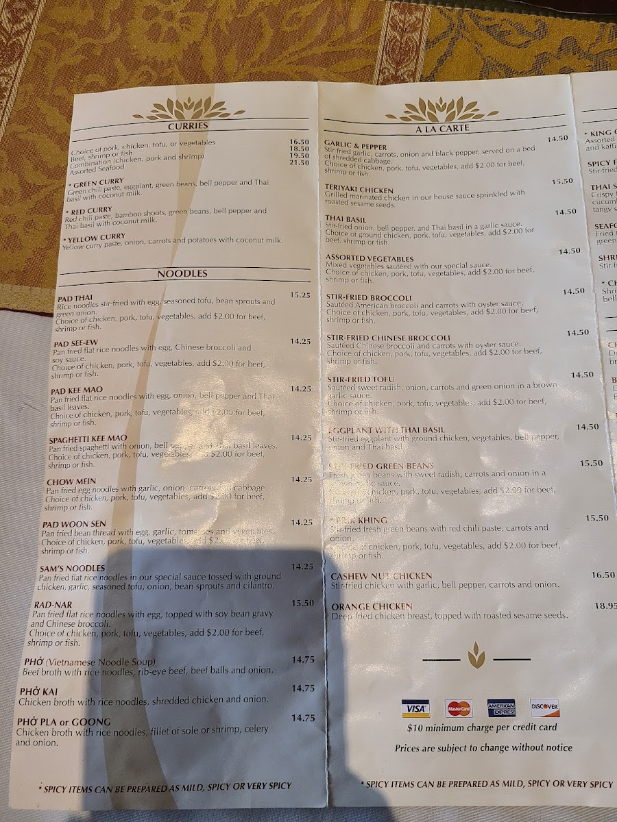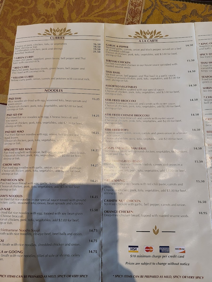 Start with a warming bowl of Tom Kha Kai or a clear vegetable broth that pairs well with the laid-back atmosphere. Curries like the mild to spicy Yellow and Green Curry bring rich, coconut-infused comfort that suits a cozy evening meal. For those looking for something with a bit more texture, dishes like the Spicy Fish or tender Crispy Beef offer satisfying depth of flavor without overwhelming the senses.